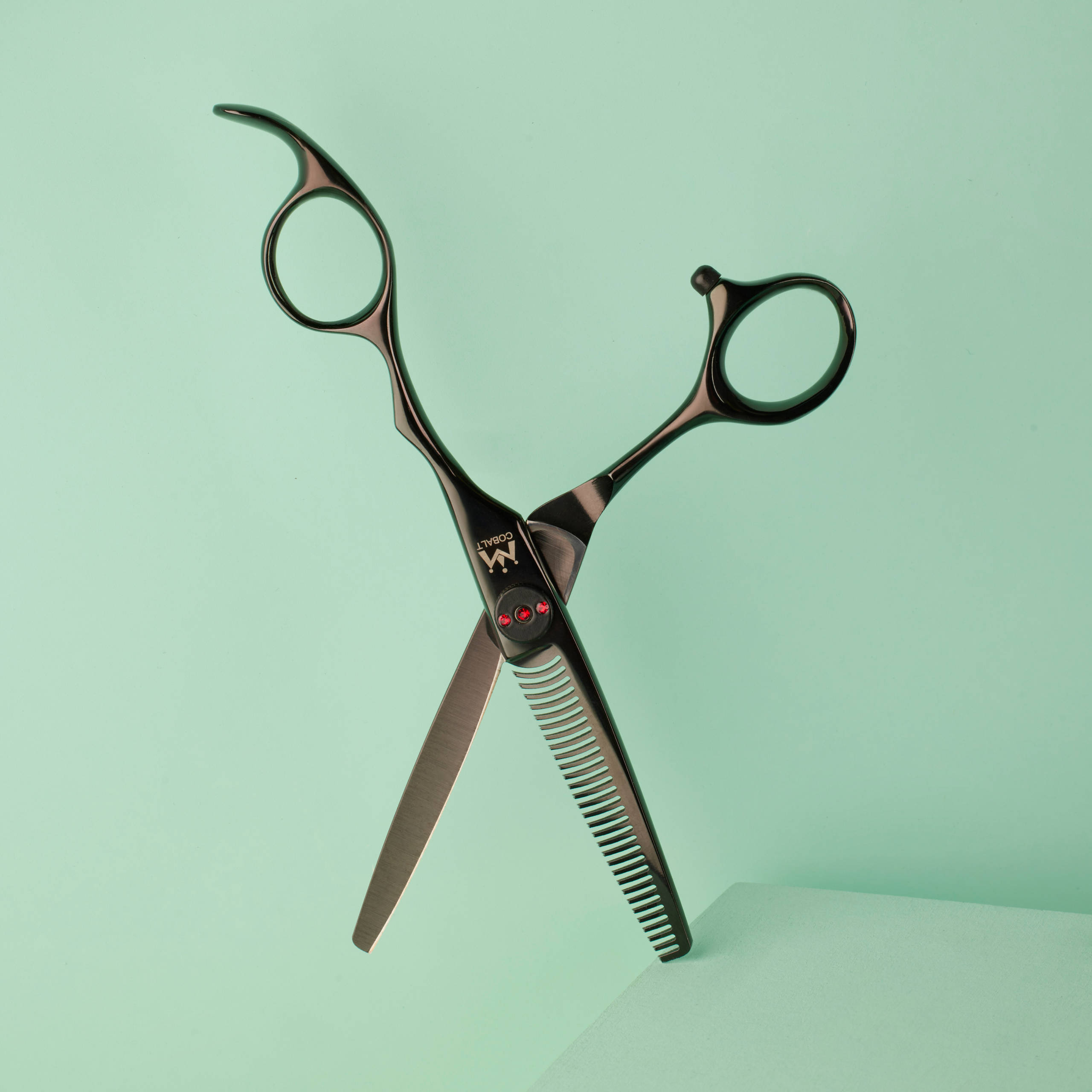 Paire de ciseaux effileur professionnels, type européen, gamme standard, en acier finition black, taille 5.5′, ergonomique 30° et porte doigt fixe