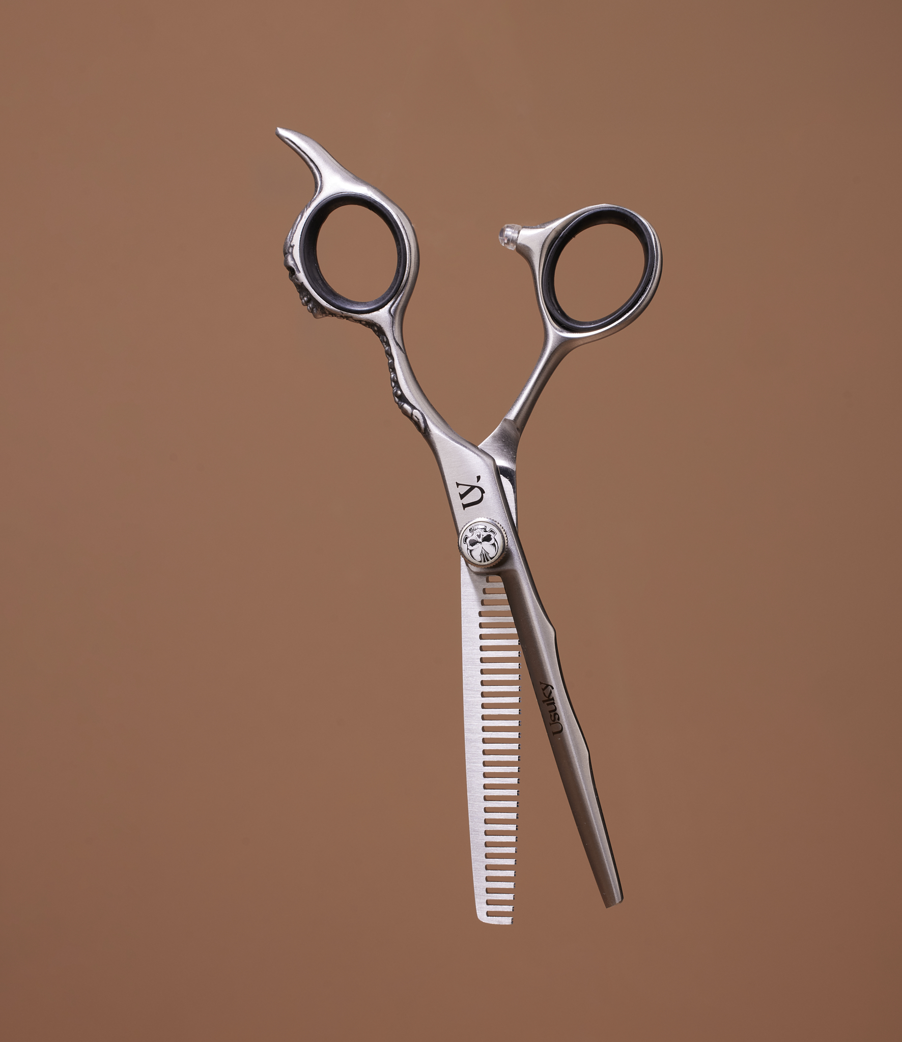 Paire de ciseaux effileur professionnels, gamme standard avec design en crâne, en acier, taille 6′, ergonomique 30° et porte doigt fixe avec vis en forme de crâne.