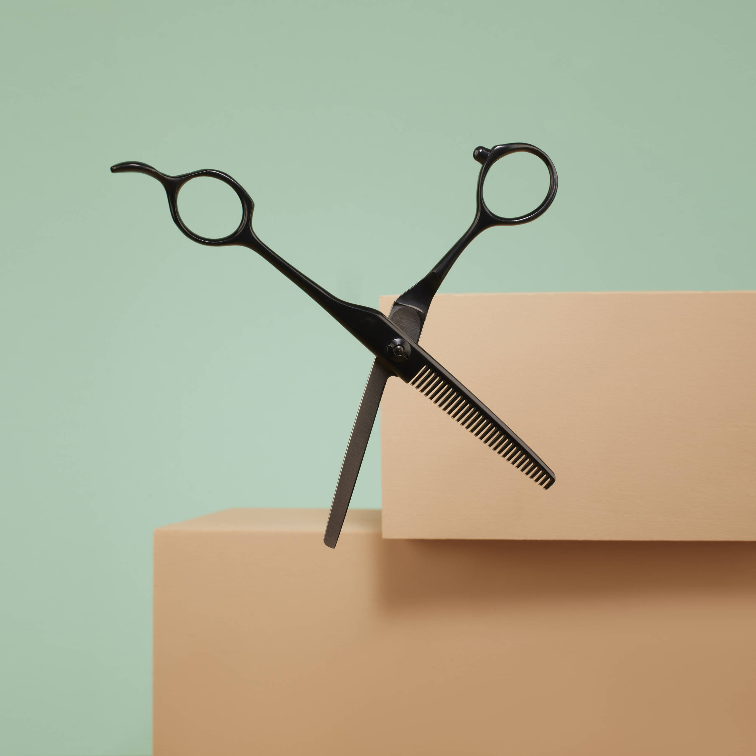 Paire de ciseaux effileur professionnels, type européen, gamme économique, en acier avec revêtement en teflon, taille 5.5′, ergonomique 30°, avec vis barbering et porte doigt fixe